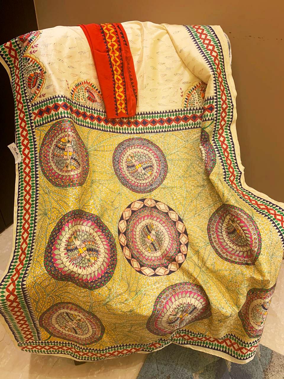 Golden Yellow Tusser silk with hand crafted Madhubani design and hand painted saree with intricate and detailed design with beautifully decorated fish and leaves spread in anchal to give an elegant look. There is a border in both sides with similar design and lovely colour combination with all time use.